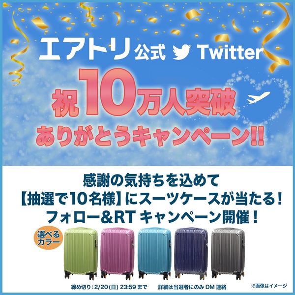 総合旅行プラットフォーム「エアトリ」公式Twitter 『10万人フォロワー突破!』 フォロー&リツイート”ありがとうキャンペーン”を実施!