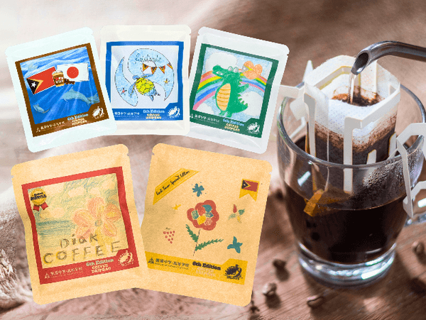 今回完成した第六弾のドリップバッグは5種類のパッケージデザインがあります。2種類のクラフト紙のうち、1種類は一般の方のデザインが使用されており、SDGs研究会が今年の8月にそごう千葉店で一般の方向けに実施したデザインを募集するワークショップで最優秀作品となったものが採用されています。もう1種類は、第五弾に引き続き、東ティモールの現地の子どもたちにデザインしてもらったものを採用しています。現地の子どもたちには、「東ティモールのお花」というテーマで、デザインをしてもらいました。これらの取り組みを通じて、今まで意識してきたトレーサビリティを可視化するだけでなく、更に消費者に東ティモールを身近に感じることができ、消費者一人ひとりの消費行動を変えていけると考えました。5つのパッケージデザインの内、 残りの3種類のデザインは全校生徒からデザインを公募し、採用されたデザインを使用しています。