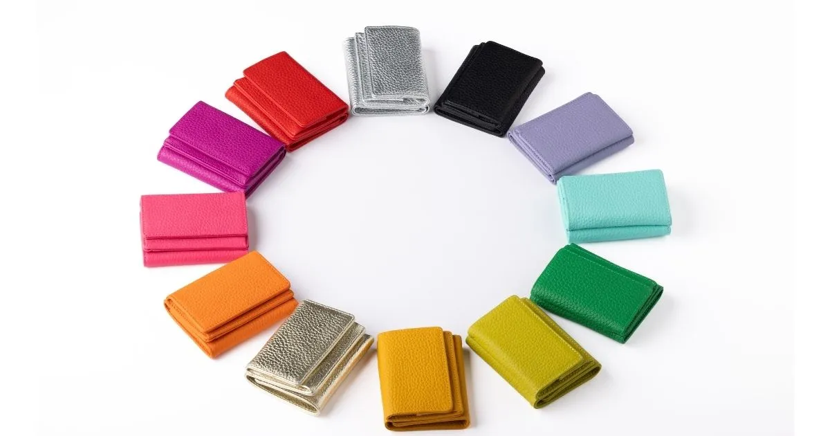 『レザー三つ折り財布』は、手のひらに収まるサイズで、コンパクトながら高い機能性を備えています。内側には4枚収納可能なカードポケットと、スナップ開閉式の小銭入れを装備。カラーバリエーションは全12色(EC限定商品も含む)を展開しており、幅広いファッションや好みに合わせてお選びいただけます。