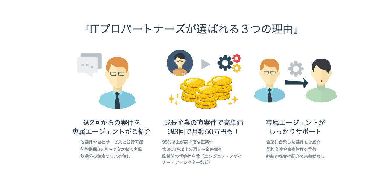 起業や新サービスの立ち上げなど、やりたいことに挑戦する時間を生み出したい優秀なエンジニアたちは、効率的な働き方を求めています。「ITプロ」は、高いスキルを持つ優秀なエンジニアやデザイナーが、そのスキルを活かして週2日から成長中の企業などで働くことができ、ビジネスの刺激や学びを得るのに加え、それ以外の時間を自分の事業に充てることができる「新しい働き方」として、優秀なエンジニアたちから注目を集めています。一方で、ますますIT化の進むなかで優秀なエンジニアの採用に悩む企業側にも、即戦力となるITプロフェッショナルをスピーディーにアサインし、活用できるメリットがあります。