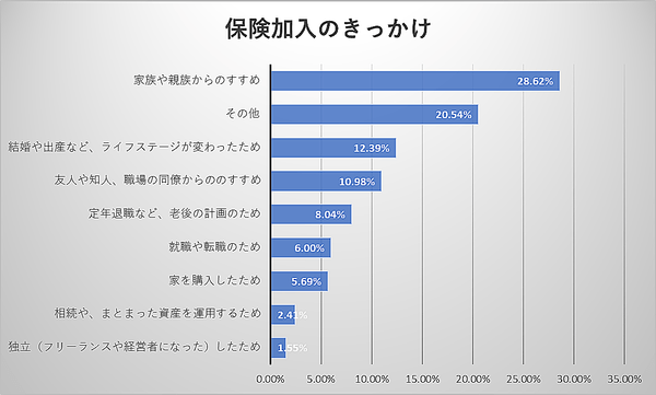 「家族や親族からのすすめ」や「ライフステージの変化」をきっかけに保険の加入を検討する人が多いです。