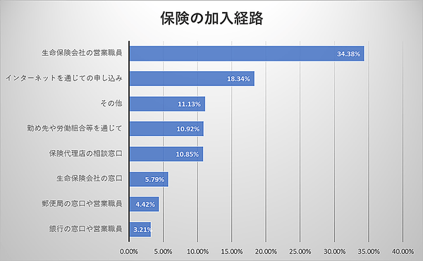 保険加入は依然として、生命保険の営業職員によるものが34.3%と最多の割合を占めます。一方、近年増加傾向のチャネルであるインターネット経由が18.3%、保険代理店経由が10.8%とそれぞれ一定のボリュームを占めています。