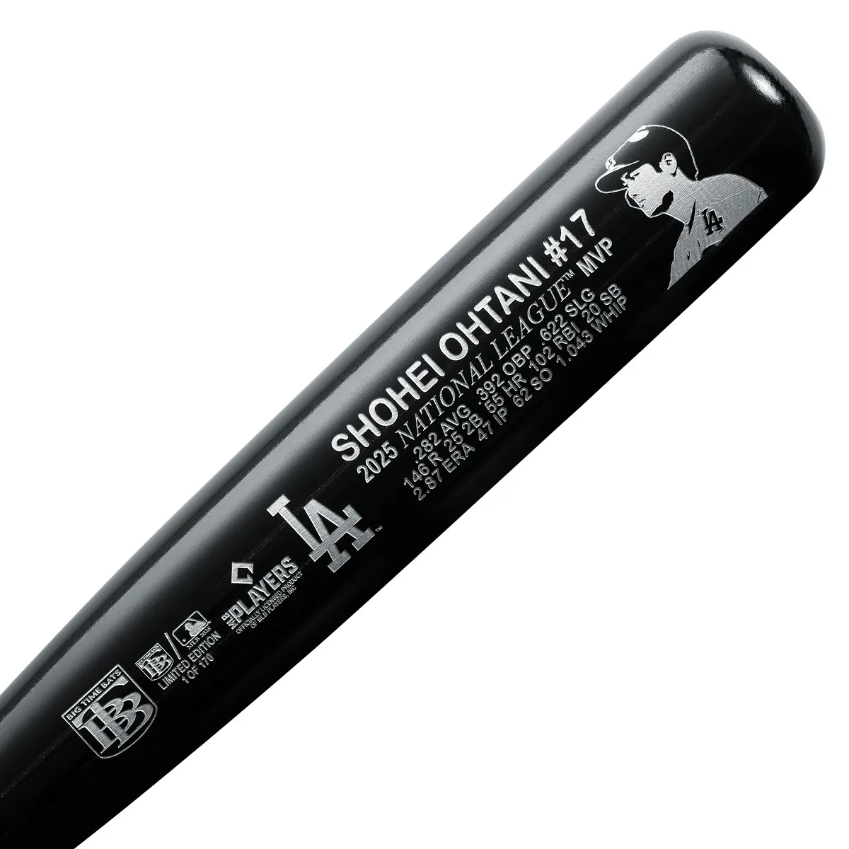 大谷翔平選手は、2025年11月13日に自身4度目となる最優秀選手(MVP)となりました。3年連続にして通算4度目のMVP、そしてドジャース移籍後2年連続の受賞。その大谷選手のMVP受賞を記したMLB/MLBPI公認の記念バットが登場。大谷選手が使用しているバットを思わせるブラックに、大谷選手の肖像とMVP記念の銘、2025年の活躍とロサンゼルス・ドジャースのロゴをシルバーカラーで刻印したオリジナル仕様。限定数170点の希少なアイテムです。