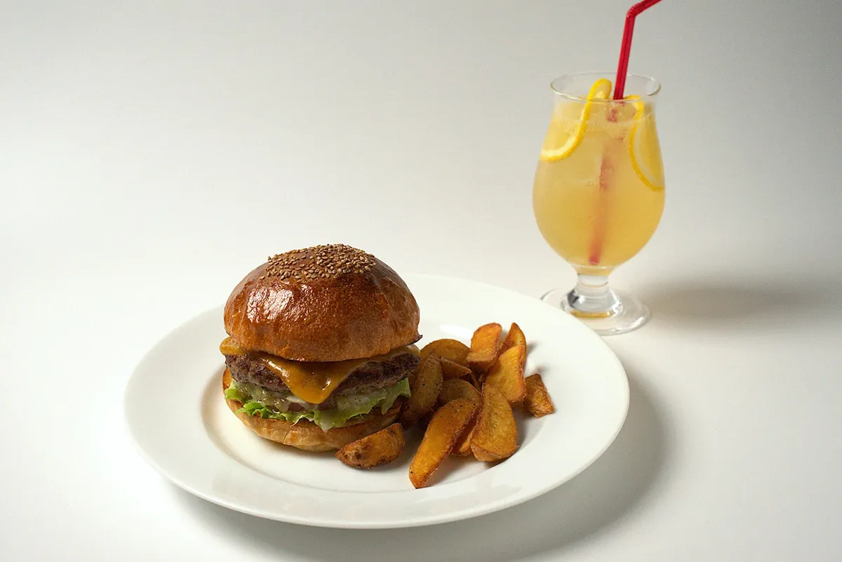 つなぎなし牛100%のパティに濃厚なチェダーチーズを重ねた、満足感たっぷりのチーズバーガー。ドリンクは、生搾りレモンと種子島産サトウキビの自家製シロップで作るレモンスカッシュ、または青森産りんごと自家製ジンジャーシロップを使ったアップルジンジャーエールから選べます。