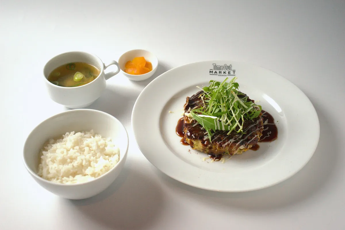 鹿児島黒豚「やごろう豚」の上質な脂を楽しむお好み焼き。生地は食べ応えがありながら軽やかな口当たり。すっきりとした特製ソースとともに。ご飯、味噌汁、漬物付き。