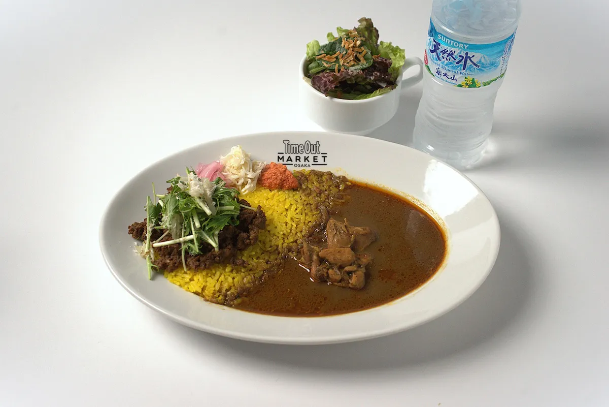 鯛出汁の和の旨みとスリランカ産スパイスが調和する、毎日でも食べたい一皿。ターメリックライスにチキンカリーと羊のキーマをあいがけ。副菜と混ぜるほどに、奥行きある味の変化が楽しめます。サラダ・天然水付き。