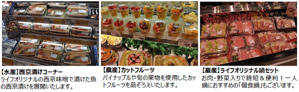 通勤や通学で駅を利用される方が多いため、惣菜の品ぞろえに力を入れ、ヘルシー系からガッツリメニューまでライフ自慢のお弁当やお寿司を種類豊富に品ぞろえいたします。また、手作りニーズにお応えする鮮度抜群の生鮮食品や、単身・共働き世帯のお客様向けに、便利な時短・簡便商品を豊富にご用意いたします。