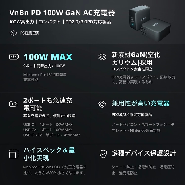 対象商品 :VnBn 100W ブラック GaN急速充電器(2mのType-Cケーブル付属)