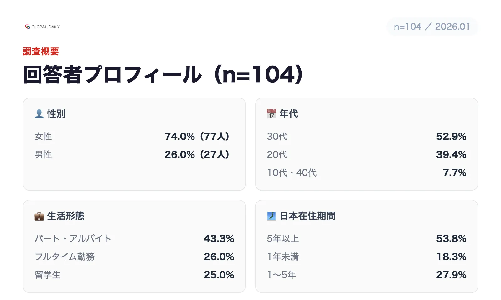 - 生活形態:パート・アルバイト(主婦・主夫を含む)43.3%、フルタイム就労 26.0%、留学生 25.0%(N=104)