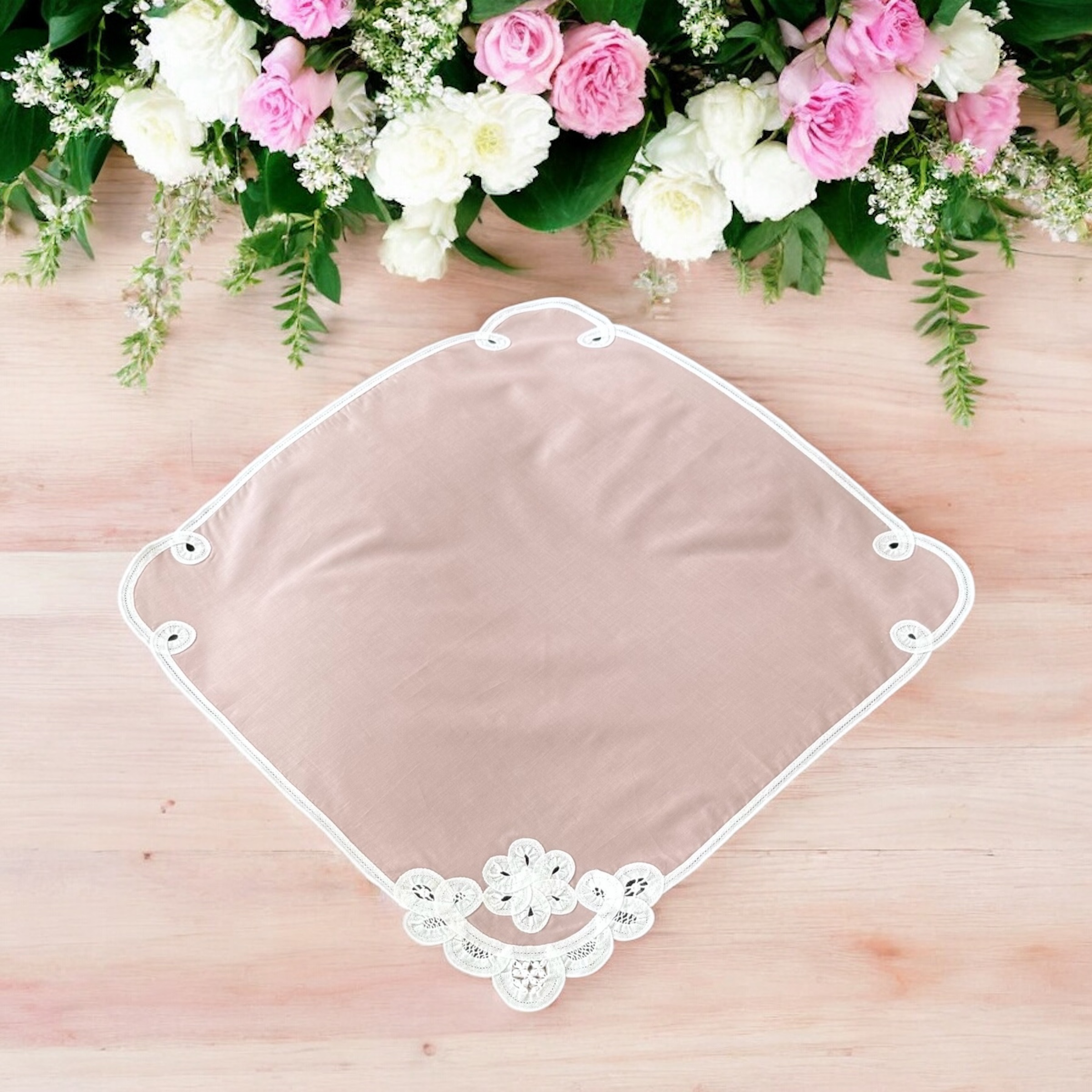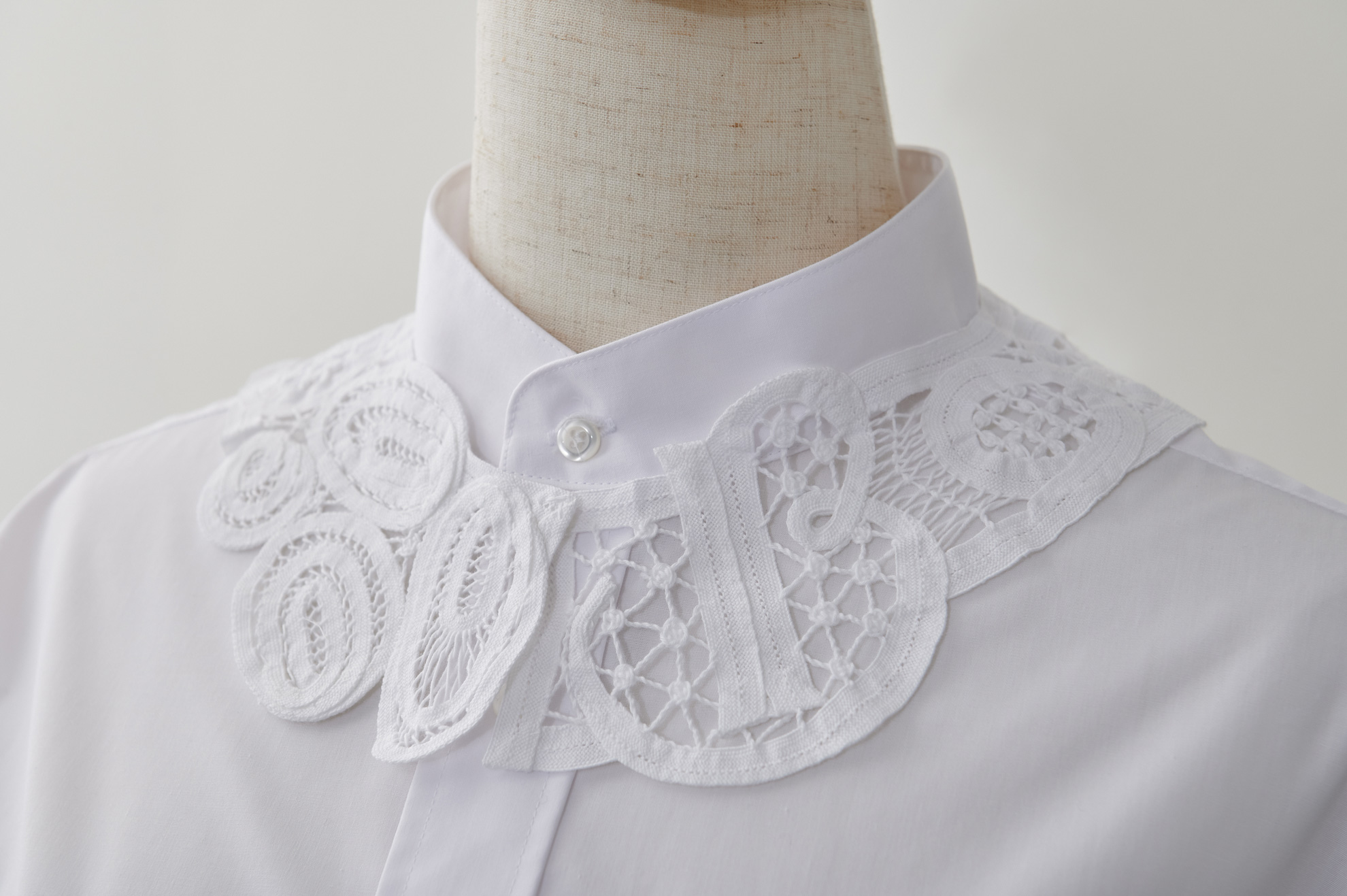 バテンレースとは、明治時代に日本に伝わったレース製品です。糸を幅1センチほどのテープ状に編んだ「ブレード」と呼ばれる縁飾りで図柄の輪郭を描き、その内側を様々なかがり模様を施して作られます。すべて手作業による職人の技術が美しいレースを生み出しています。