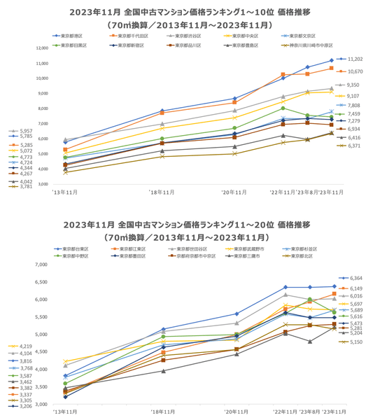調査。坪単価をベースに70㎡での価格に換算した「中古マンション価格」*1と価格ランキング上位20件について過去10年間の価格推移、および1年前からの価格の上昇率を表す「騰落率」のランキングを発表いたします