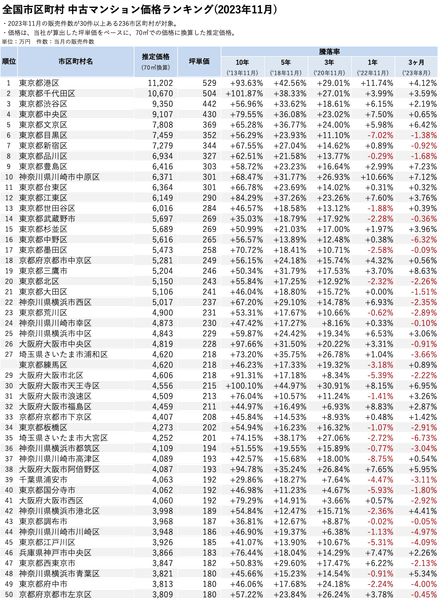 「マンションレビュー」2023年11月 全国市区町村 中古マンション価格/騰落率ランキング100を発表