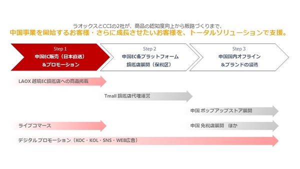 CCIは、国内外の豊富な取引実績に基づくプロモーション知見、運用ノウハウと、多数の中国主要メディアとの連携を活かし、「訪日施策」「越境EC」「現地PR」におけるワンストップでのマーケティング支援サービスに取り組んできました。そしてラオックスは、中国における強固な事業基盤や越境EC運営および越境物流等のノウハウを持ち、現地グループ会社等との連携により、中国における実店舗およびEC運営、商品PR、販路拡大等、リテールビジネスのトータルソリューションを提供しています。