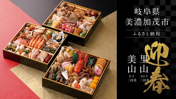 岐阜県美濃加茂市のふるさと納税限定の返礼品として、三段重のおせちが掲載されました。本返礼品は、美濃加茂市のふるさとをイメージさせる厳選食材を贅沢に盛り込み、年始にふさわしい華やかで縁起のよい品々を詰め合わせた限定生産のおせちです。こだわりの味わいを、ふるさと納税を通じて全国の皆さまへお届けします。本取り組みは、受託自治体数98自治体、ふるさと納税サイト運営数366件の実績※がある株式会社サイバーレコード(本社所在地:熊本県熊本市、代表取締役社長:増田一哉)のサポートによるものです。