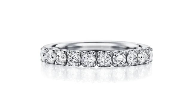 大粒のメレダイヤモンドが10石並んだ、月の女神の名を持つハーフエタニティリングです。きらめきに満ちながらも、落ち着いた存在感があり、印象は上品でエレガント。石座で包み込むようにセッティングすることで、引っ掛かりにくく、普段使いしやすい設計になっています。リングの内側には、寄り添うハート型の窓が。エンゲージリング、マリッジリングとしてはもちろん、特別なアニバーサリーにもふさわしい普遍的なリングです。