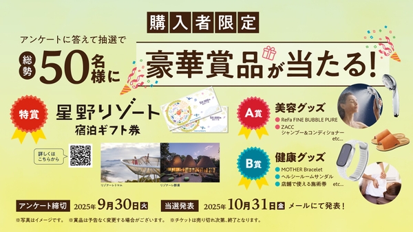 また、チケットをご購入いただいたお客様には、アンケートにご回答いただくことで、星野リゾート宿泊券など豪華景品が当たるキャンペーンも実施いたします。