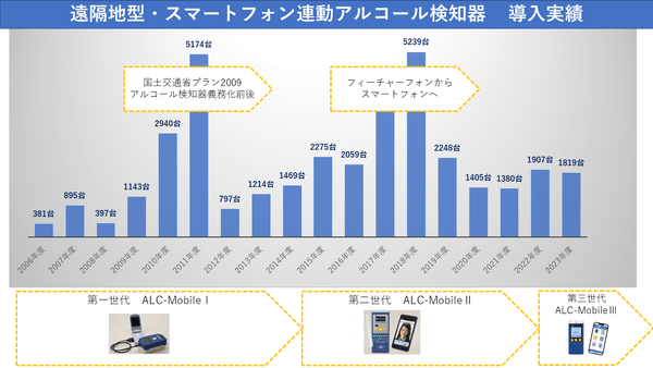 2020年度以降、新型コロナウイルスによる旅客事業者様の苦境による投資抑制、白ナンバー義務化による同業他社との価格競争により実績がやや低迷しましたが、その後、貸切バスのデジタル点呼法令や、第Ⅲ世代ALC-MobileⅢの市場投入によりやや持ち直しています。
