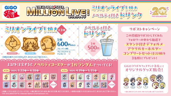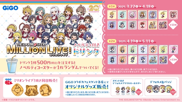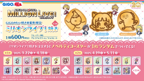 株式会社GENDA GiGO Entertainment(本社:東京都港区 代表取締役社長:二宮 一浩 以下、「当社」)は当社の対象店舗におきまして、『アイドルマスター ミリオンライブ!』とコラボレーションしたコラボたい焼き、ノベルティ付きドリンク、オリジナルグッズの販売をいたします。