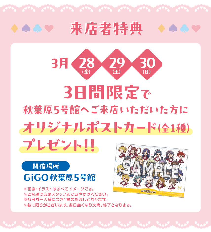 3月28日(金)29日(土)30日(日)の3日間限定で、GiGO秋葉原5号館ではご来店いただいた方にオリジナルポストカードをお一人様につき1枚進呈いたします。