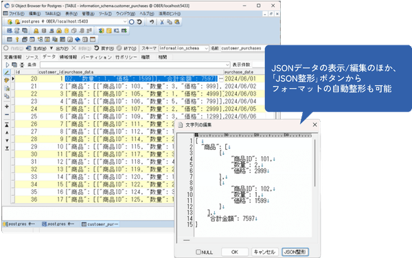 最新バージョンでは、JSON(JavaScript Object Notation)のデータ型に対応し、JSONデータの表示や編集が可能になりました。JSONは、軽量なデータフォーマットとしてAPIやデータ分析といった分野で広く使用されています。