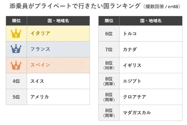 4位には雄大な自然が楽しめるスイスが入り、5位には北米からアメリカがランクインしています。6位のトルコ、8位のエジプト、クロアチアなど、旅行のプロならではの選択も見られました。