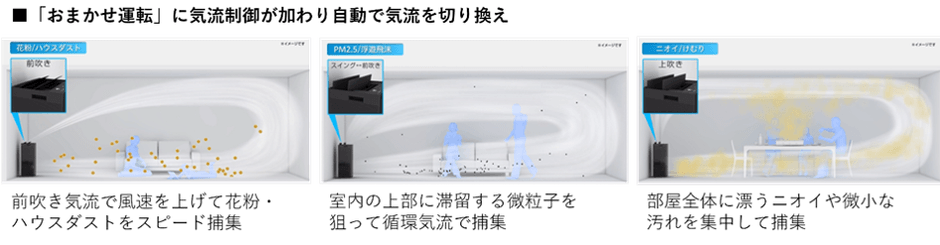 また、室内の空気中に浮遊する花粉やハウスダスト、PM2.5などの粒子の大きさを高感度センサーで判別し、大きさに合わせて気流を自動的に制御する風向自動を併用した「おまかせ運転」や、用途に合わせて選べる「パワフル花粉」「浮遊飛沫」モードも新たに搭載しています。