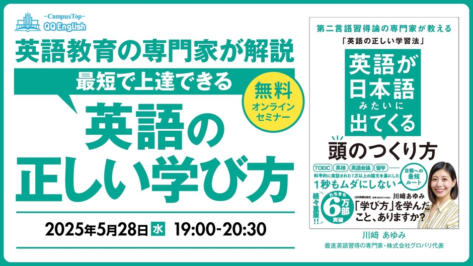 株式会社QQEnglish(本社:東京都渋谷区、代表取締役:藤岡頼光、以下QQEnglish)は、2025年5月28日(水)19時から最速英語習得の専門家・株式会社グロバリ代表の川﨑あゆみさんをお招きして、「最短で上達できる!英語の正しい学び方」と題した無料オンラインセミナーを実施することをお知らせいたします。