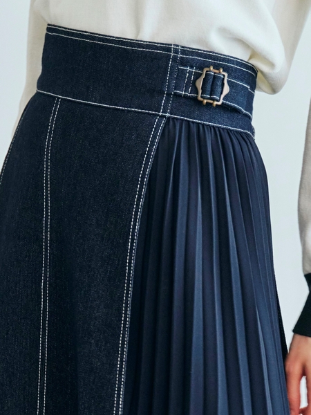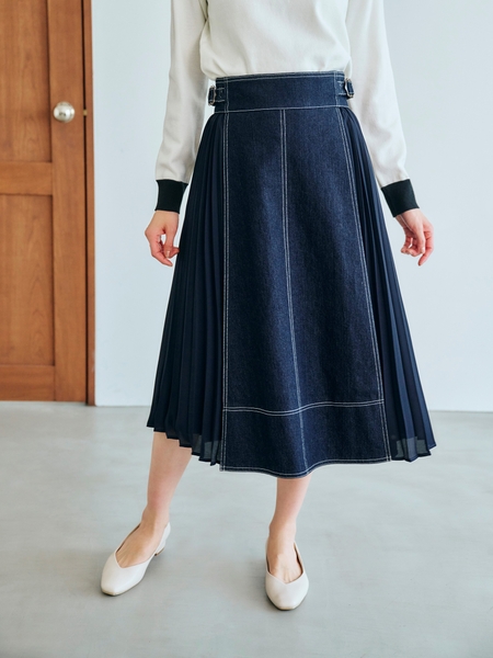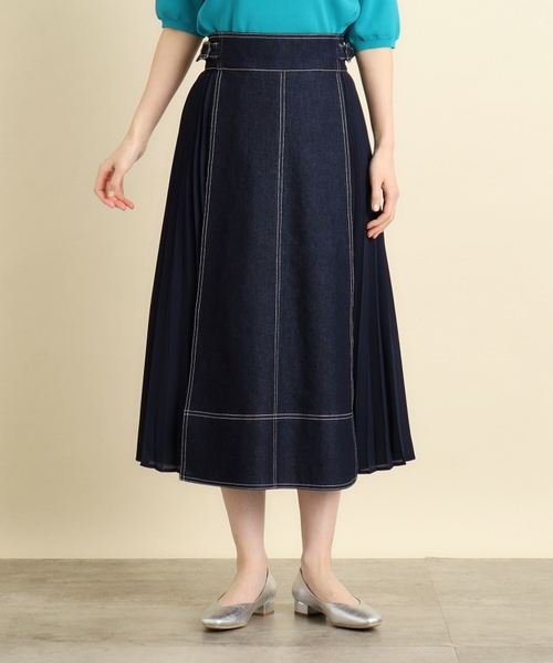 ゴールドのバックルがアクセントの、腰位置が高くスッキリ見えるAラインシルエットのスカート。カジュアルになりがちなデニム素材のスカートも女性らしくご着用していただけます。