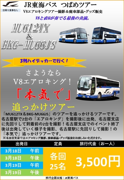 ジェイアール東海バスが開催するバスツアー「V8と直6が奏でる最後の共演。MU612TX&BKG-MU66JS」(2023年3月18日(土)・19日(日))ですが、大変多くのお申し込みをいただきました。