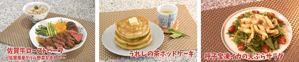 写真は、鳥栖工場のある佐賀県のおいしい食材「佐賀牛」「うれしの茶」「呼子宝凍イカ」を使ったメニューです。どれも食べてみたくなりませんか?