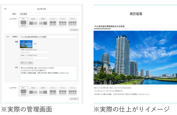 デザインテンプレートが用意してあり、管理画面から物件の写真や概要、周辺エリアの情報を入力するだけで特設サイトが完成。