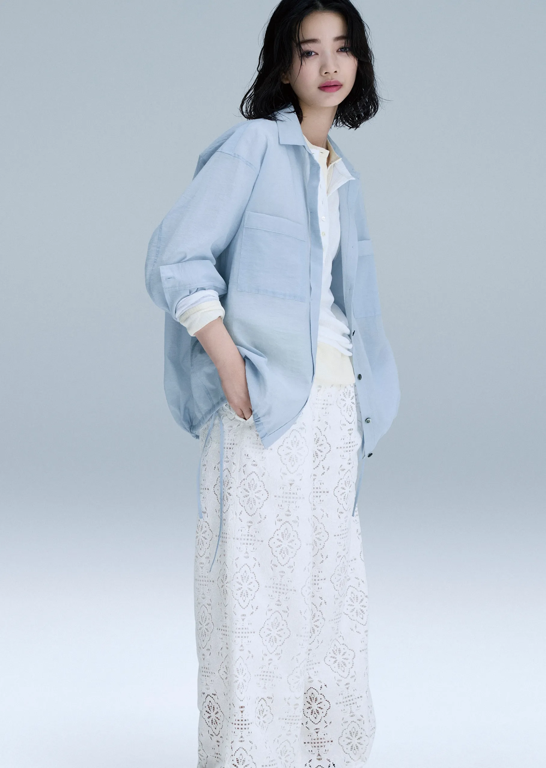 見上さんが着こなす、『23区』の最新春夏コーディネート合計10パターンを公開します。「Cool」と「Cute」、それぞれのイメージに合わせた二面性を表現する、見上さんの表情にも注目です。