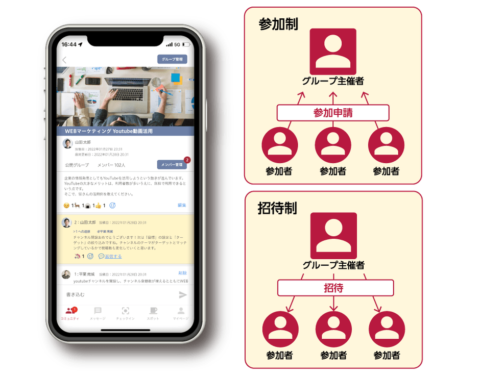 グループは招待制または参加申請タイプで作成でき、社内のグループウェアやスクールの連絡ツール、共通の趣味のグループなど様々なシーンで活用可能です。アプリの「コミュニティ」の中の「グループ」をタップして機能を使うことができます。「グループ」機能は無料です。