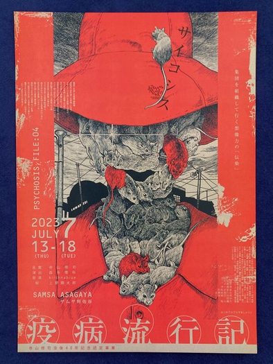 こちらのチラシは、朱に染まった第一印象のインパクトと、よく見るとネズミが山のように集まり人の形を成している細部の生々しい恐ろしさが特徴です。数匹だけ真っ赤になったネズミと、『疫病流行記』のタイトル、「集団を組織していく想像力の『伝染』」というキャッチコピーが合わさり、恐ろしい想像が掻き立てられます! このチラシから手に取った人へと想像が伝染していく、強いパワーを持った1枚です。
