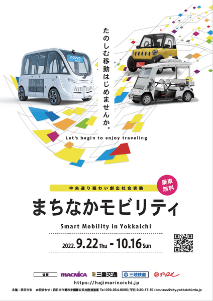 株式会社マクニカ(本社:神奈川県横浜市、代表取締役社長:原 一将、以下 マクニカ)、三重交通株式会社(本社:三重県津市、代表取締役社長:竹谷 賢一、以下 三重交通)、三岐鉄道株式会社(本社:三重県四日市市、代表取締役社長:渡邉 一陽、以下 三岐鉄道)、芙蓉総合リース株式会社(本社:東京都千代田区、代表取締役社長:織田 寛明、以下 芙蓉リース)、日本信号株式会社(本社:東京都千代田区、代表取締役社長:塚本 英彦、以下 日本信号)は、三重県四日市市にて実施する中央通り賑わい創出社会実験における自動運転バスを活用した「まちなかモビリティ」実証実験(以下 本実証実験)へ参加します。これは、四日市市、交通事業者、経済団体等の関係者で構成される「自動運転導入検討会議*1」並びに令和3年度に発足した「四日市スマートリージョン・コア 推進協議会*2」にてスマートシティ創出に向けた実証実験に協力するもので、近鉄四日市駅とJR四日市駅間の中央通り(以下 中央通り)において、自動運転バスをはじめとするモビリティの活用を通じた賑わいの創出検証や自動運転社会実装に向けた課題を探る目的で実施されます。