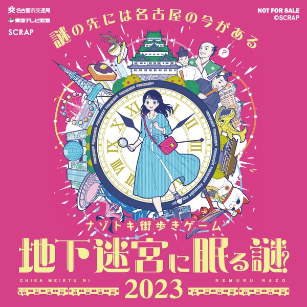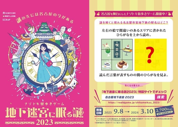 リアル脱出ゲームを主催、企画制作する株式会社 SCRAP(所在地:東京都渋谷区、代表者:加藤隆生)は、東海テレビ放送(所在地:愛知県名古屋市、代表者:小島 浩資)および名古屋市交通局(所在地:愛知県名古屋市)は、3社共催にて開催するナゾトキ街歩きゲーム『地下迷宮に眠る謎2023』の開催を記念して、本日2023年9月1日(金)から10月31日(火)までの期間限定で、謎を掲出した名古屋市営地下鉄東山線の特別列車の運行決定を発表いたします。