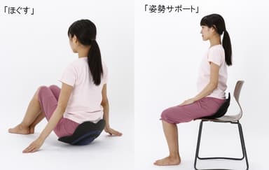 3つの突起部分に座ることでお尻周りの筋肉をほぐし、真ん中に座ることで体幹を鍛え、平らな部分に座ることで、正しい姿勢に導く姿勢サポートが期待出来ます。