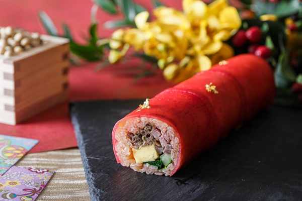 ささがき牛蒡や有馬山椒、生姜で甘辛く煮たてた国産牛のしぐれ煮と、“北海道産しほろ牛”のローストビーフ2種のお肉をふんだんに具材に取り入れた贅沢な恵方巻。春菊や大葉、ミョウガの酢漬け、きゅうり、卵焼きなどの食材と合わせ、ビーツで炊き上げた酢飯とマリネした紅くるり大根を纏わせて色鮮やかに仕上げました。※一本約20cm