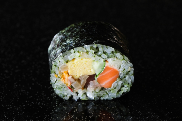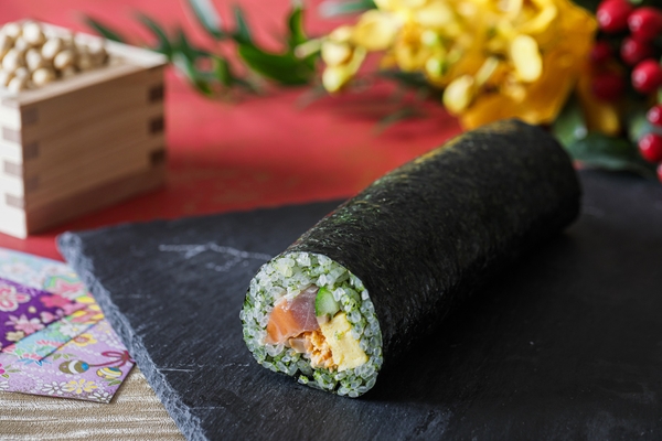 まぐろ、サーモン、ズワイガニの海鮮3種をメインに、いぶりがっこ、生姜、みょうが、とびっこ、きゅうり、大葉、白ごま、卵焼きなど計11種類の具材を三重県産のあおさで色付けした酢飯と海苔で仕上げた具沢山な海鮮恵方巻。様々な食感をお楽しみいただけます。※一本約20cm