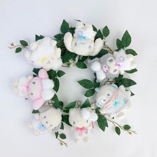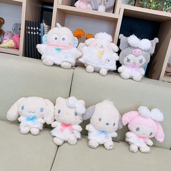 淡いくすみカラーがポイント!ふわふわワンピースを身に着けた、サンリオ癒されキャラクターズ♪ぬいぐるみとマスコットがもこもこ!