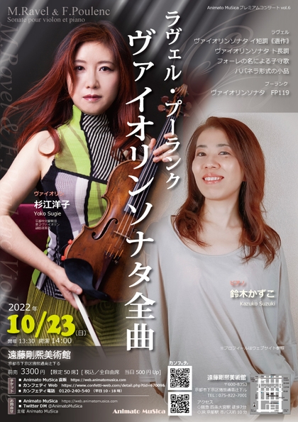 Animato MuSica オトナの勉強会 プレミアムコンサート vol.6『ラヴェル・プーランクヴァイオリンソナタ全曲』が2022年10月23日 (日)に遠藤剛熈美術館(京都府京都市)にて開催されます。チケットはカンフェティ(運営:ロングランプランニング株式会社、東京都新宿区、代表取締役:榑松 大剛)にて6月23日(木)よりチケット発売開始です。