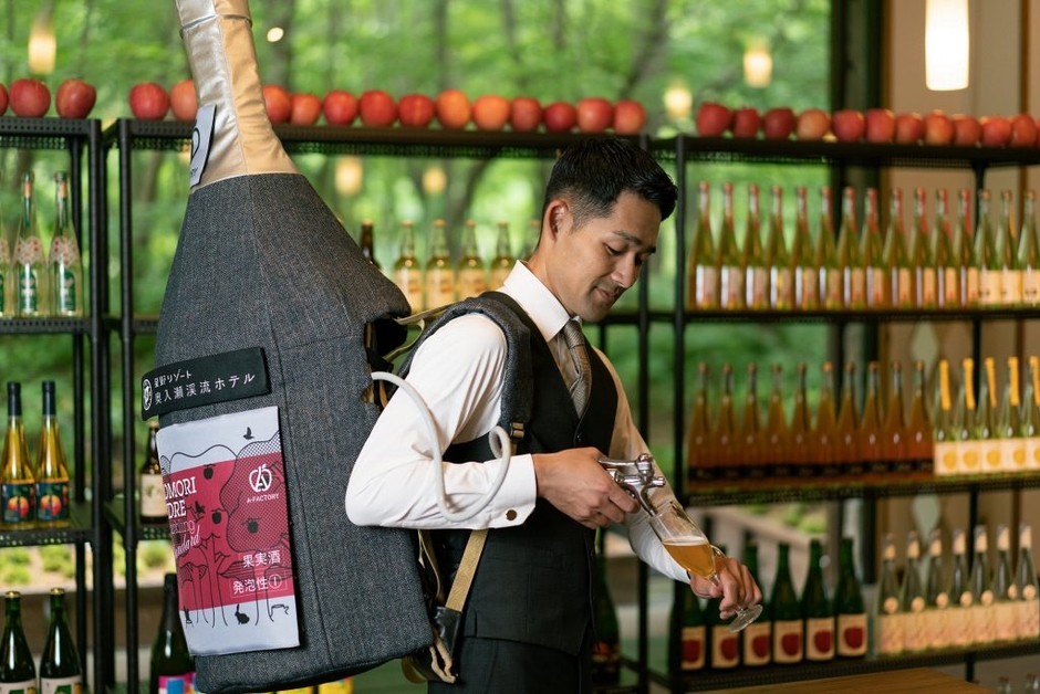 奥入瀬(おいらせ)流沿いに建つ唯一のリゾートホテル「星野リゾート 奥入瀬渓流ホテル」では、2021年11月1日~28日の期間、青森の醸造所が造ったこだわりのシードルを提供する「奥入瀬ウェルカムシードル」を実施します。期間中、オリジナルサーバーを背負ったスタッフが、りんごから造るお酒「シードル」をウェルカムドリンクとして振る舞います。こだわりぬいて造られたシードルを味わうことで、地域を応援できる取り組みです。