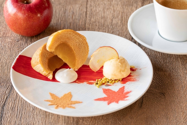 会場内のカフェスペースでは、信州の秋を代表する果物「りんご」を用いたスイーツやドリンクを提供します。スイーツは2種類あります。一つは「蜜りんごのしっとりバウムクーヘン」です。糖蜜で煮込んだりんごをバウムクーヘンで包んだ焼き菓子で、シナモンがほんのり香る生地と、ほどよく食感が残ったりんごの相性が絶妙な味わいです。アイスクリームと生クリームを添えています。もう一つは、「りんごとシナモンケーキのデザートガレット」。りんごのコンポートやサイコロ状に切ったシナモンケーキ、ローストしたくるみなどをガレット(蕎麦粉のクレープ)にのせて、仕上げにキャラメルソースを絡めています。ドリンクは、りんごのほのかな香りとミルクのやさしい甘さに心が和む「ふわふわミルクのアップルティー」を用意します。読書をしながら、甘いものを食べる、至福の時間です。