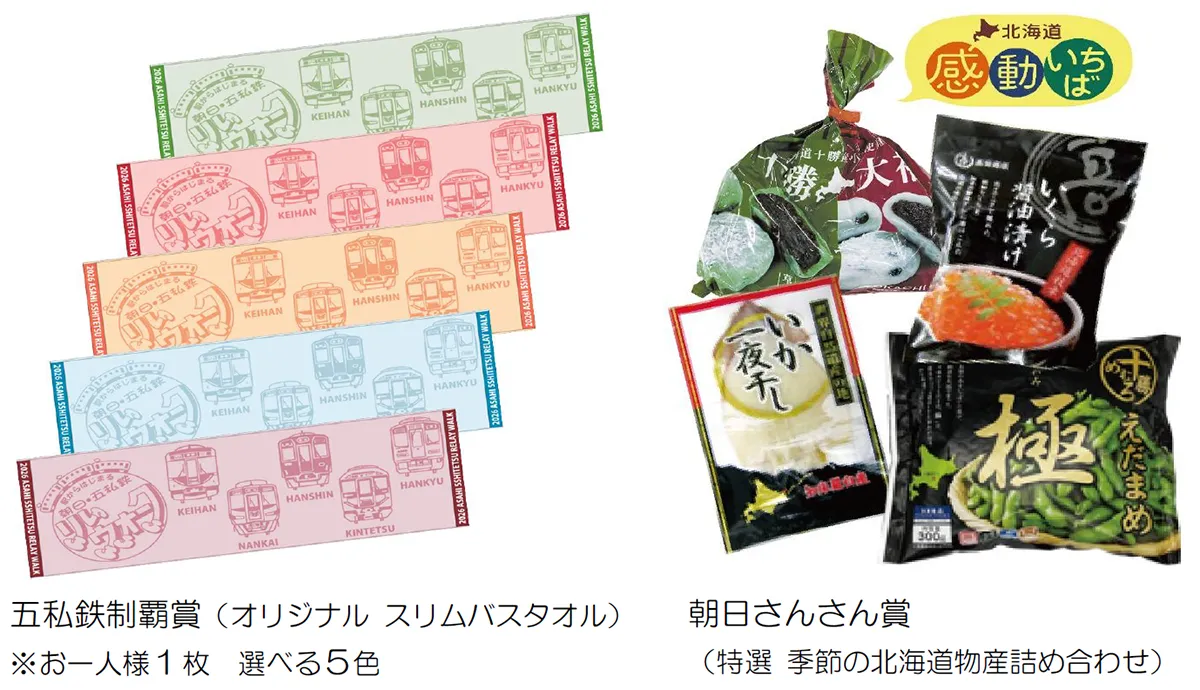 参加費は無料で、事前申込不要です。第1回(京阪回)参加の方全員に初回参加賞(オリジナルワッペン)をプレゼントいたします。さらに全5回すべてに参加された方には「五私鉄制覇賞」を、各回ごとに抽選で「朝日さんさん賞」を、それぞれ進呈いたします。