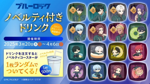 ポップアップイベント開催期間中、全国のGiGOグループのお店でご購入1点につき、オリジナルデザインコースター(全16種)がランダムで1枚ついてくるノベルティ付きドリンクを販売いたします。