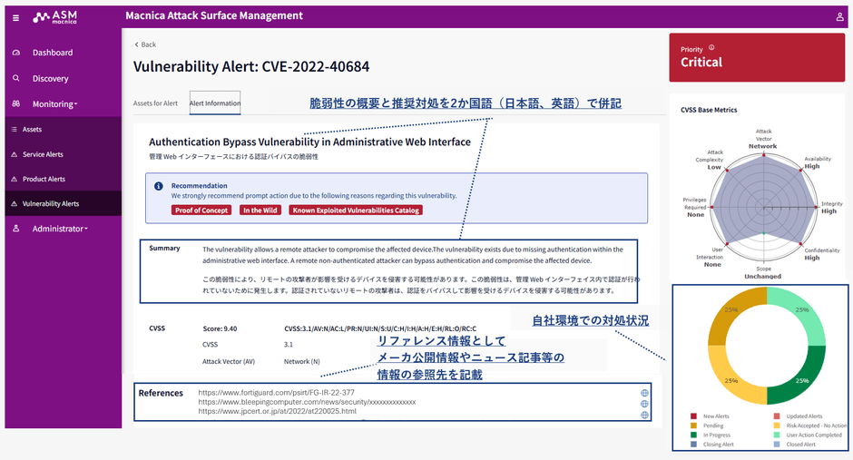 Macnica ASMのポータルでは、エキスパートがノイズとなる不要なアラートを極力排除し、対処が必要なリスクを絞り込んだ上で情報を提供するため、大量の誤検知・脆弱性アラートに悩まされることなく、的確なリスク管理と対処が可能となります。また、ASM運用に特化した設計のため、お客様の資産情報や対処状況を一元的に管理するコミュニケーションツールとしても機能し、効率的な運用を支援します。