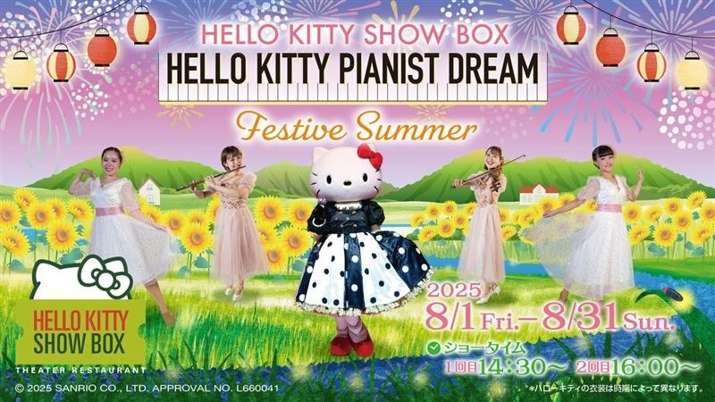 ハローキティのショーと食事が楽しめるシアターレストラン「HELLO KITTY SHOW BOX」では、大人気カフェショー HELLO KITTY PIANIST DREAMの夏公演 『Festive Summer』を8月1日(金)より開催いたします。