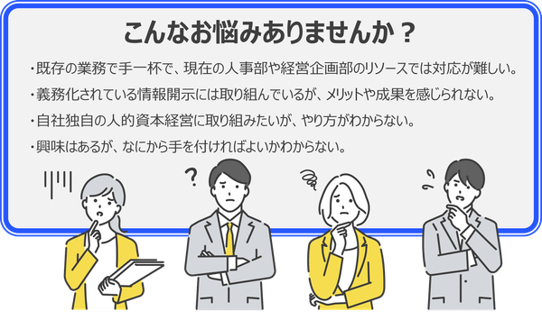 2023年3月期に、有価証券報告書に人的資本項目の開示が義務付けられ、人的資本経営を推進する潮流が企業経営に影響を及ぼしています。ジョブ型雇用への制度改正や自律的キャリア形成など、新しい形のマネジメントが求められ、皆様の企業でも、議論や検討が進んでいるのではないでしょうか。そのような背景のなか、社内リソースに課題がある、情報開示の効果が感じられない、などお悩みの方も多くいらっしゃいます。