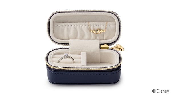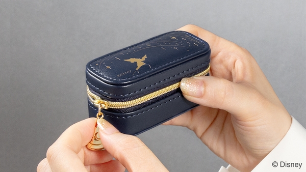 このほどの新作は、『ファンタジア』をモチーフにしたネイビーに、ゴールドの箔押しで「ミッキー」が魔法を放つシーンをイメージした、ケイウノのオリジナルデザインです。手のひらにおさまる持ち運びしやすいサイズで、蓋の裏側にはポケットをつけ、ネックレスを絡まりにくく収められる仕様です。