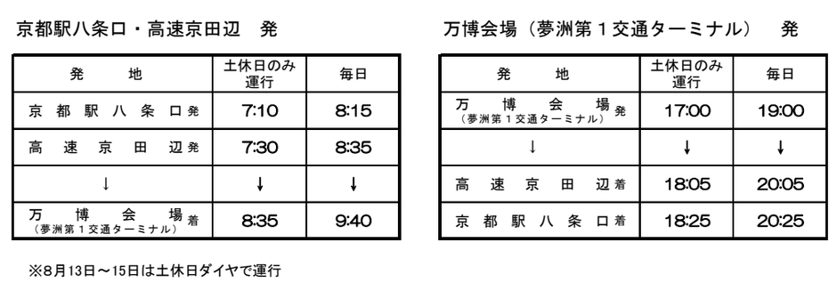京都駅八条口~万博会場 大人2,000円 小児1,000円